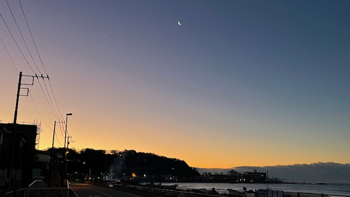 海沿いの国道まで出たら、見事な朝焼けに糸月が浮かび、それに寄り添うように明けの明星が輝いていた。