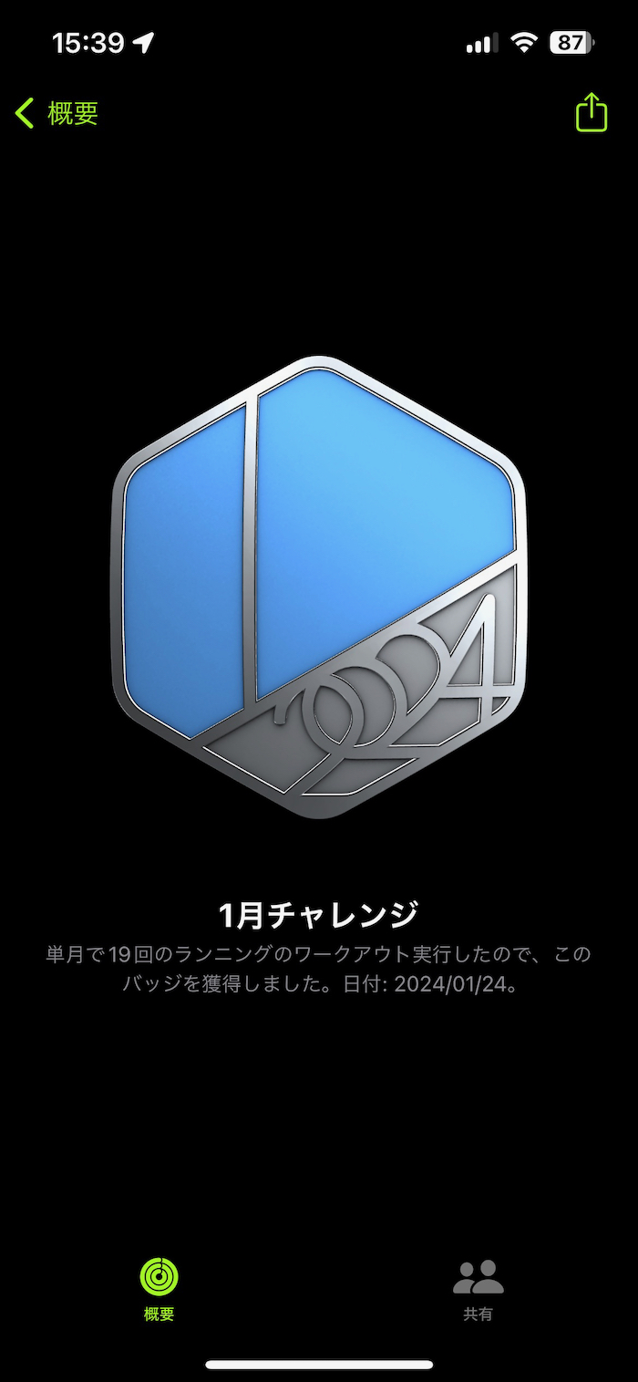 今日も1km走ってApple Watchのアクティビティの「1月チャレンジ」を達成してバッジをもらった。