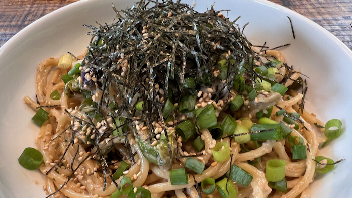 ▲ 揚げ茄子ブームが到来中で、いつもの明太子クリームパスタにも揚げ茄子を加えてみた。