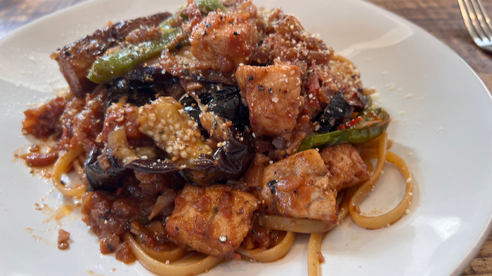 カジキマグロと揚げ茄子のトマトソースパスタ