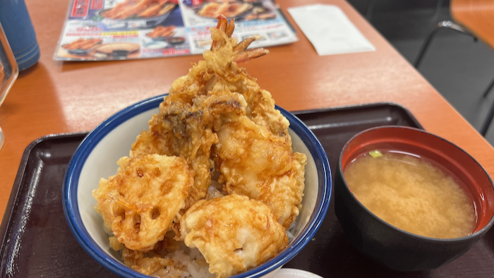 ▲ 大船の「天丼てんや」で期間限定の「夏のごちそう天丼」に舞茸とレンコンをトッピングして食べた。
