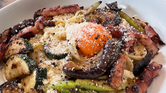 茄子とズッキーニを入れ、麺はマンチーニのリングイネで美味しく完成。