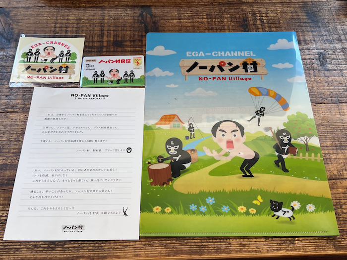 ▲ YouTubeのエガちゃんねるメンバーシップ「ノーパン村」の村民証一式が届いた。