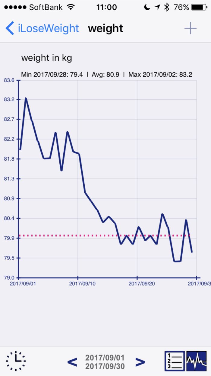 8月あたまには86kgあったのが、79kgまで落ちてきた。