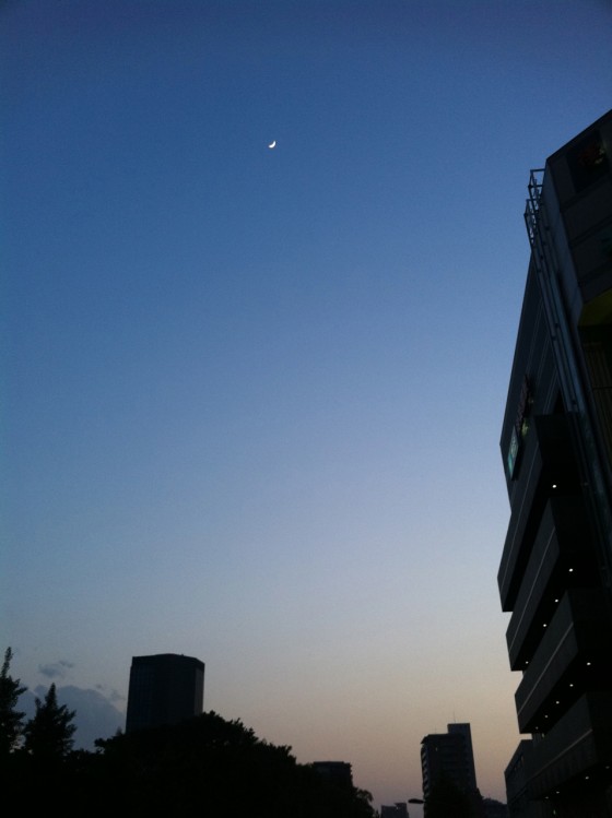 月もキレイな夕暮れ時の東京ドームシティ。