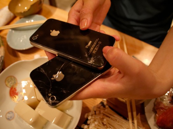 割れてしまったiPhone 4が2台。片方が大将のでもう片方がやよの。痛々しい。