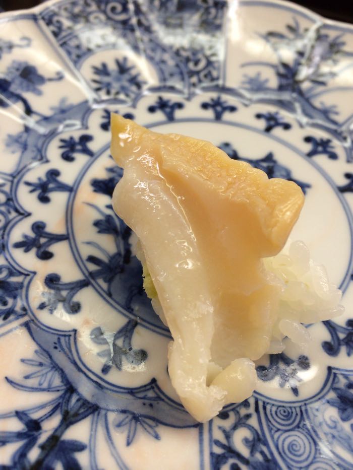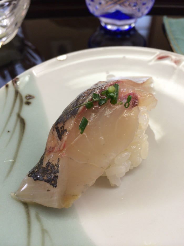 ▲ 鯵。面白いのが、アワビからスタートして、中トロやヅケなど、重いネタが先に続き、徐々に白身や光り物になっていくところ。