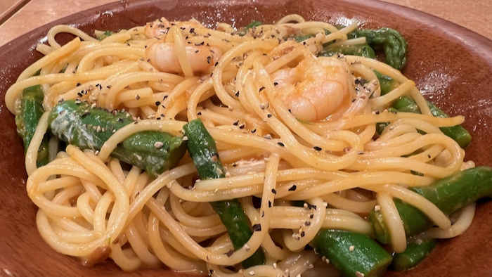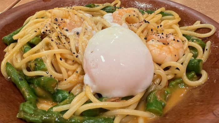 ▲ たまにはパスタを食べようと、新製品の海老とアスパラガスのオーロラソースパスタを。