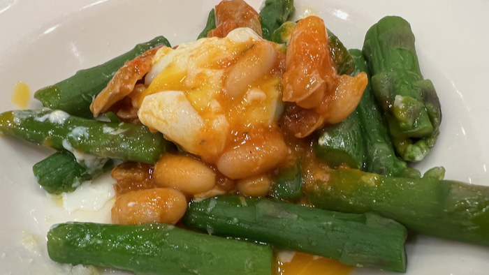 ▲ イタリア風もつ煮込みとアスパラガス温サラダを合体させてみた。