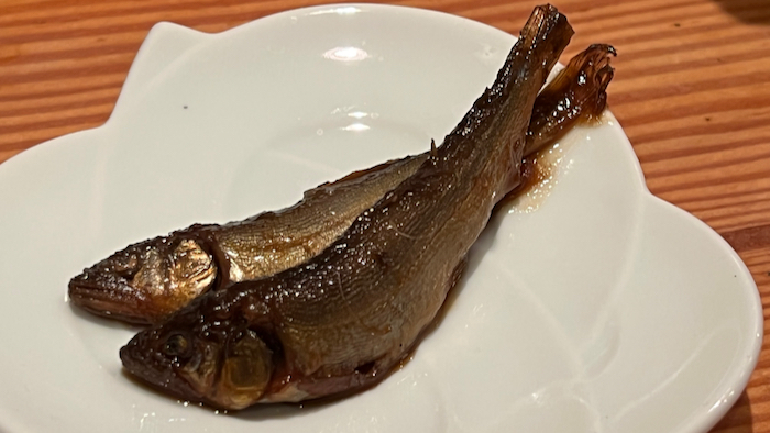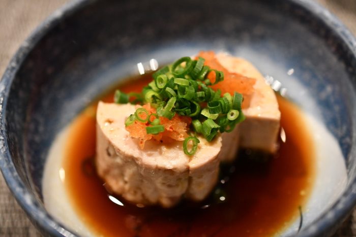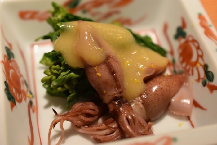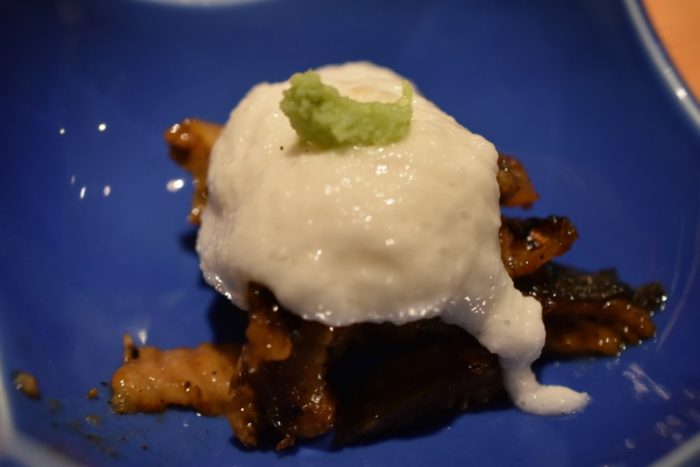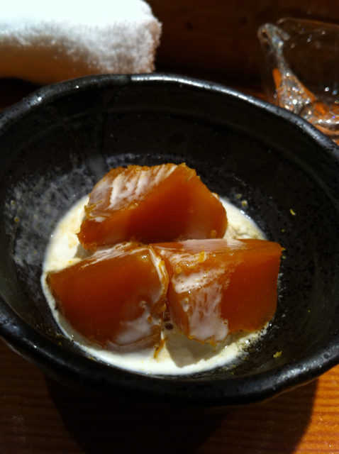 まずはお通し。カボチャを牛乳で炊いたもの。ふんわり柔らかい味ですごく美味しい!甘くないので酒のつまみにもバッチリ。