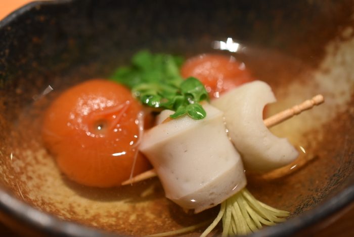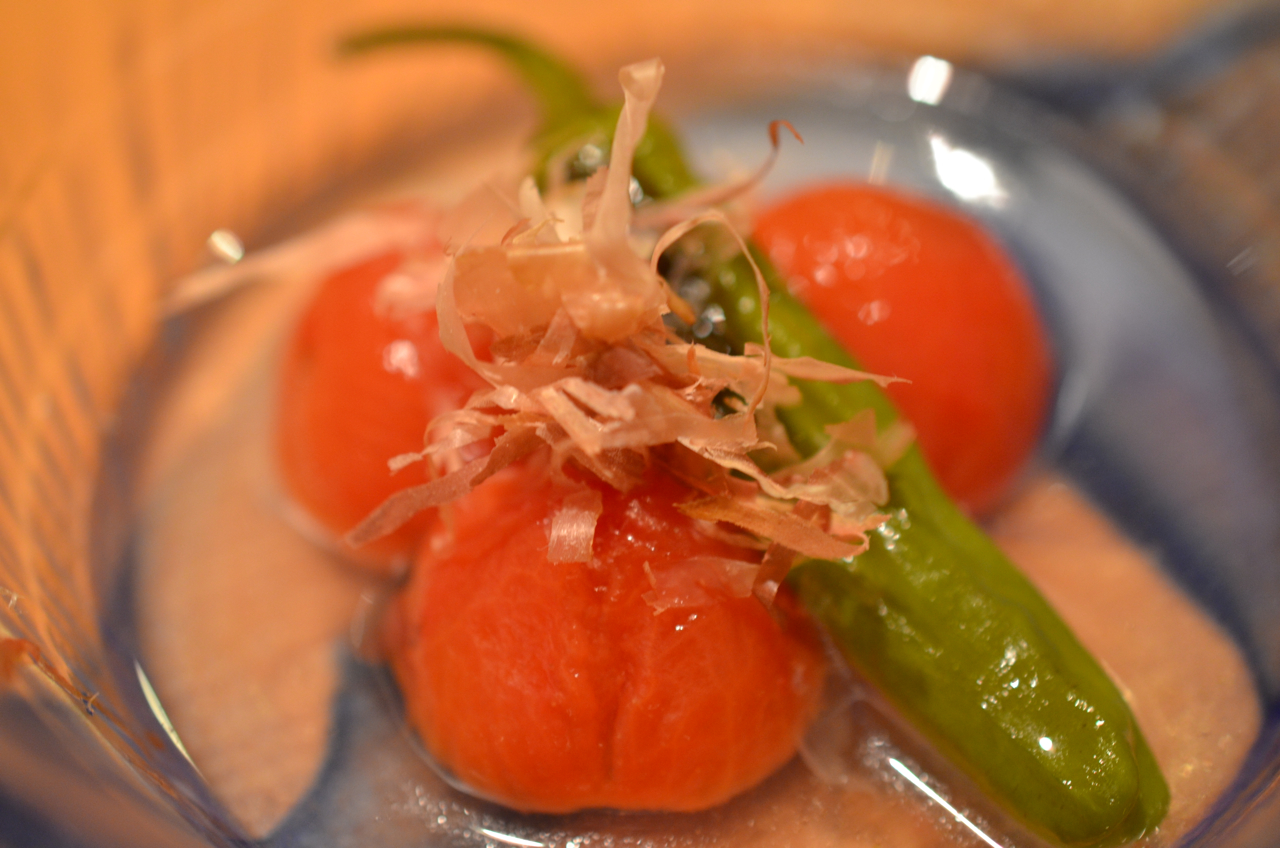 ビールで乾杯すると、お通しとして登場したのはプチトマトとシシトウの揚げびたし。