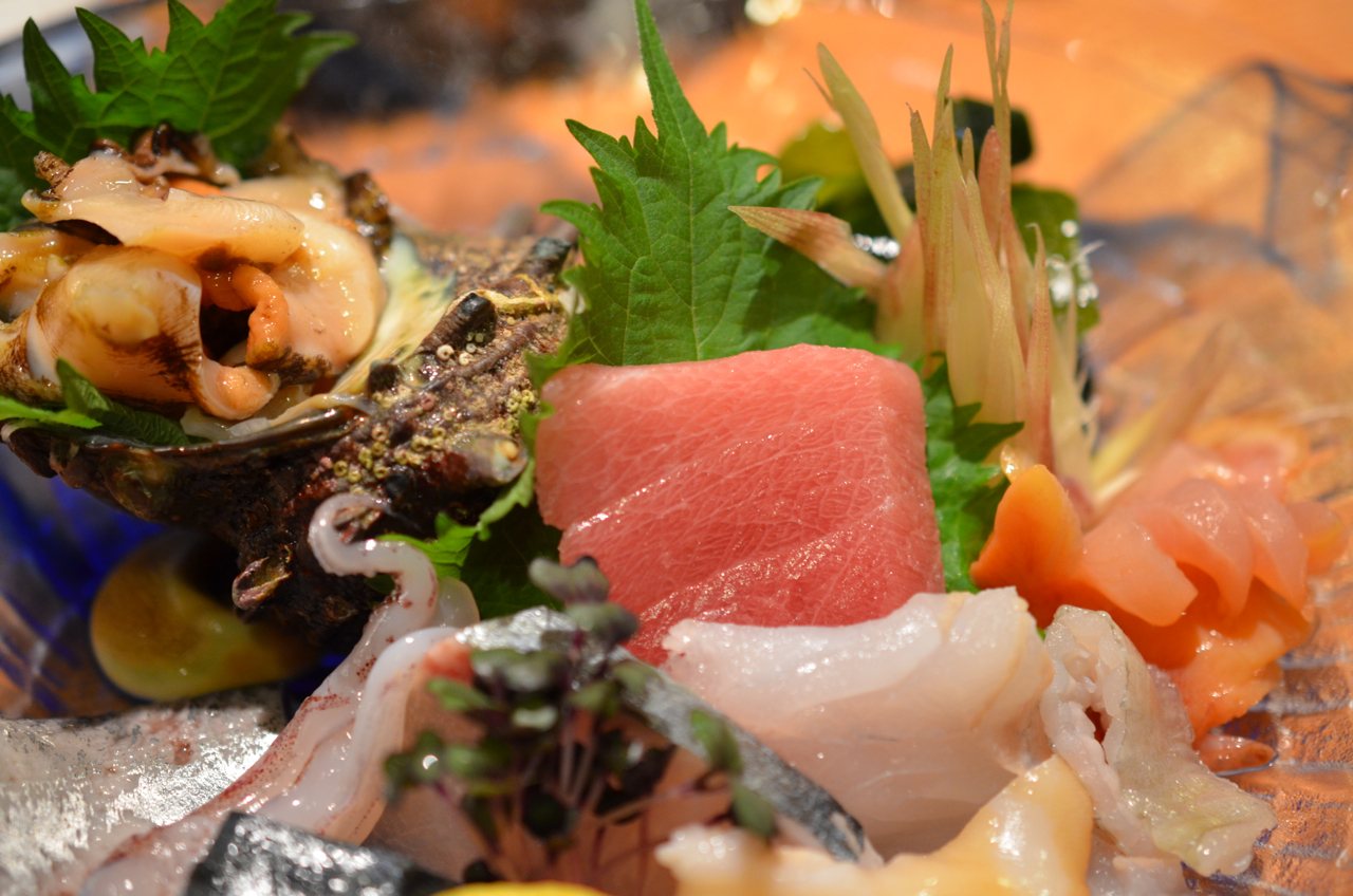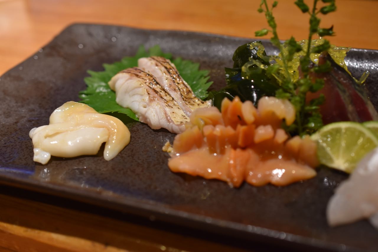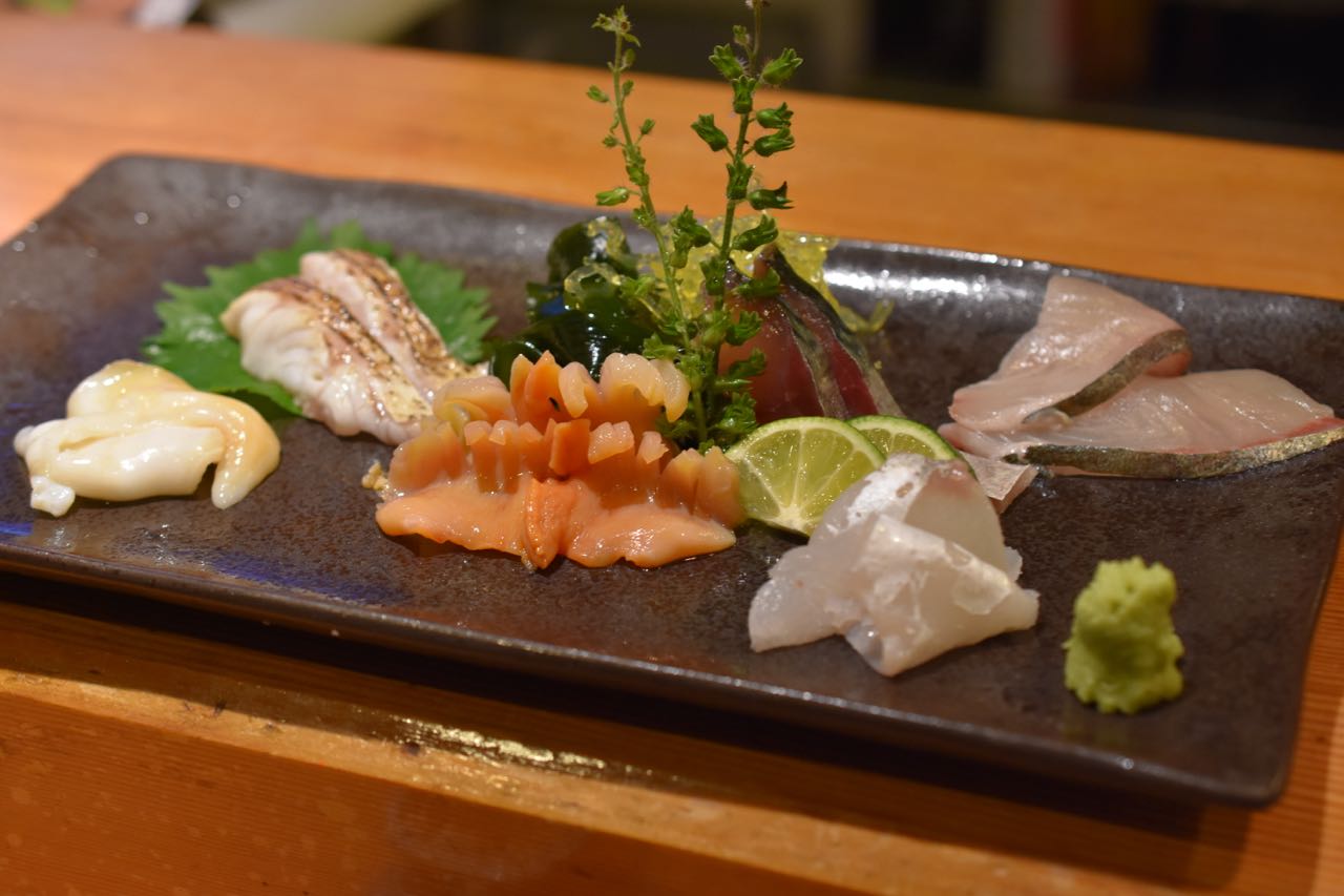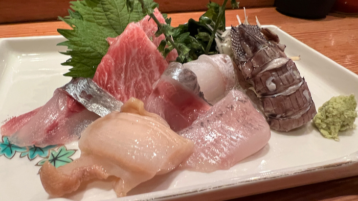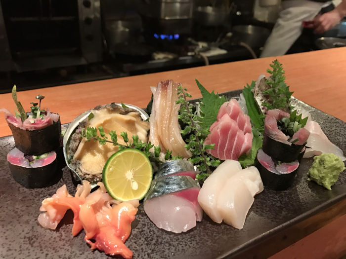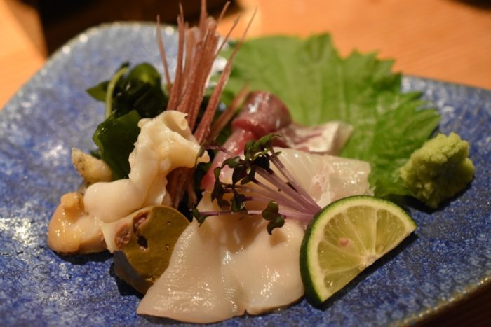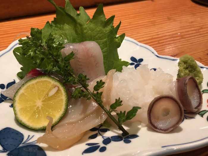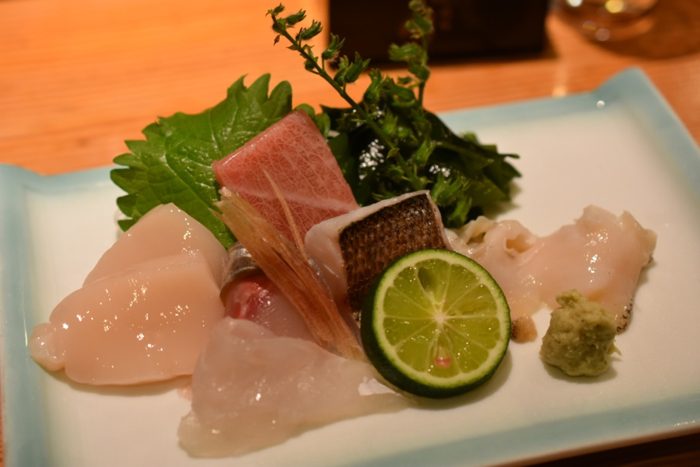 そしてお造りどーん!嬉しいのが、ほんの一切れづつ、色んな種類をたくさん盛り合わせてくれること。鯖、赤貝、平貝、カツオ、中トロなどなど、美しく盛り合わせていただきました!