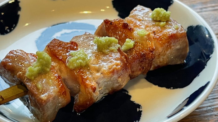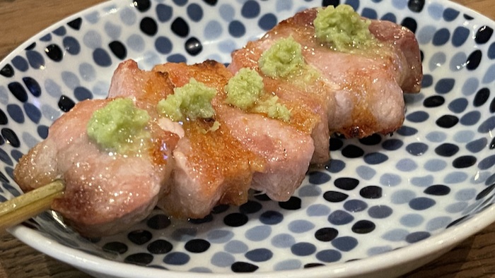 ▲ これも僕の大好物、豚バラ串、塩とワサビで。
