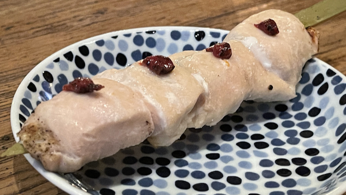 ▲ 串焼き。鶏のささ身、梅肉で。