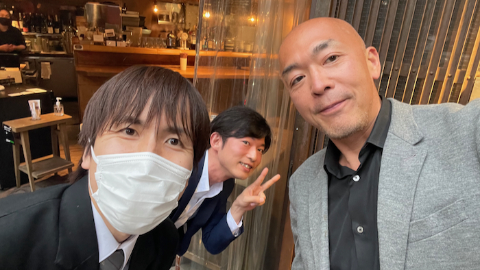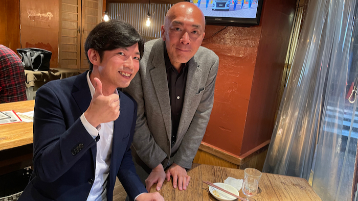 ▲ 二人で飲んでいたら、たまたま通りがかったタクシー運転手を仕事でしているお友達が僕らに気づいて降りて来てくれた。