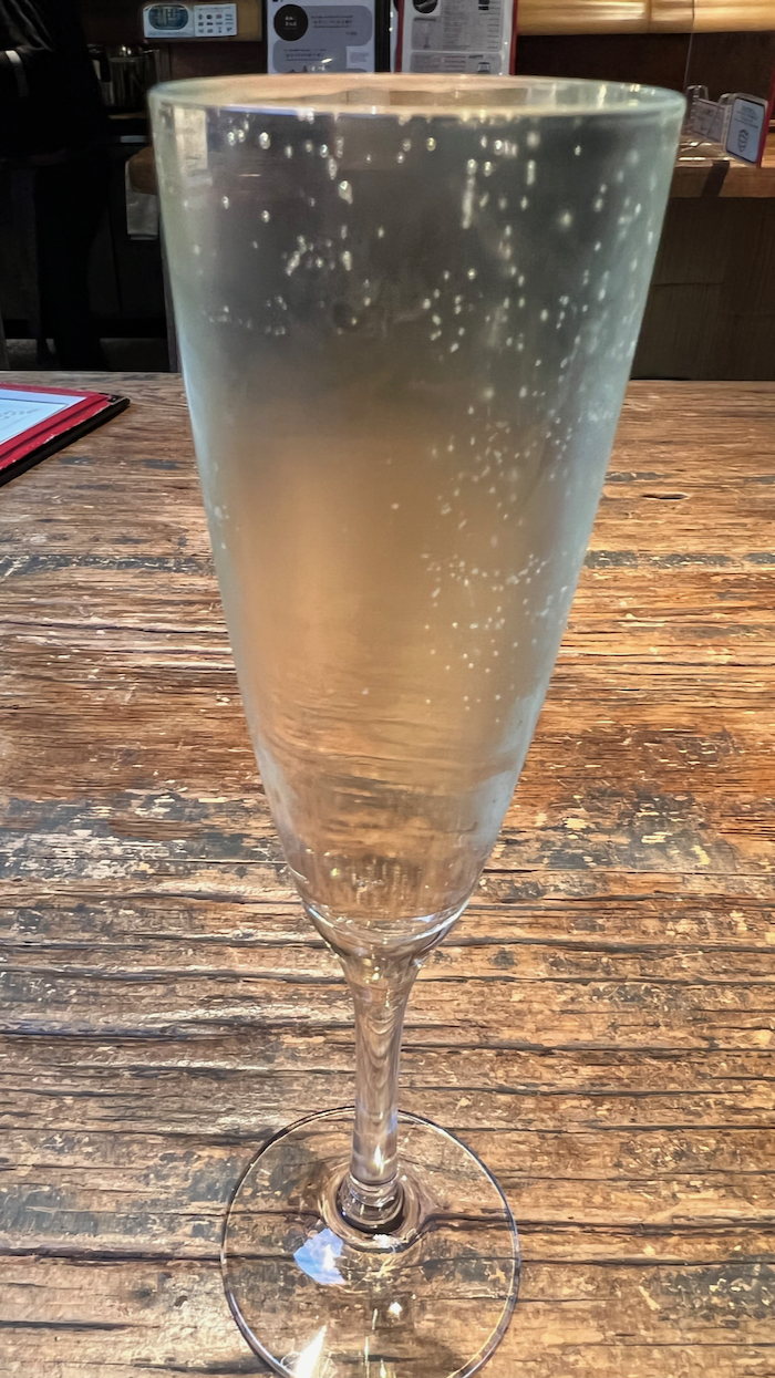 ▲ 今回もやはりなみなみ表面張力の「こぼれスパークリング」で乾杯。