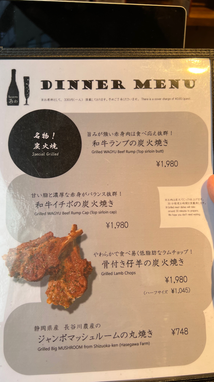 ▲ この日は夜に「寿司さいしょ」で会食なので食べられないが、メニューにこのような魅力的な炭火焼きが登場していた。