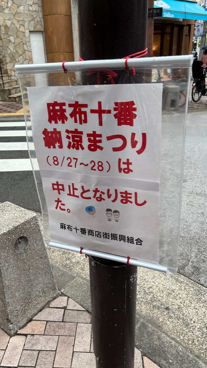 ▲ お店の目の前には、今年も麻布十番納涼まつりが中止になったとの貼り紙が。
