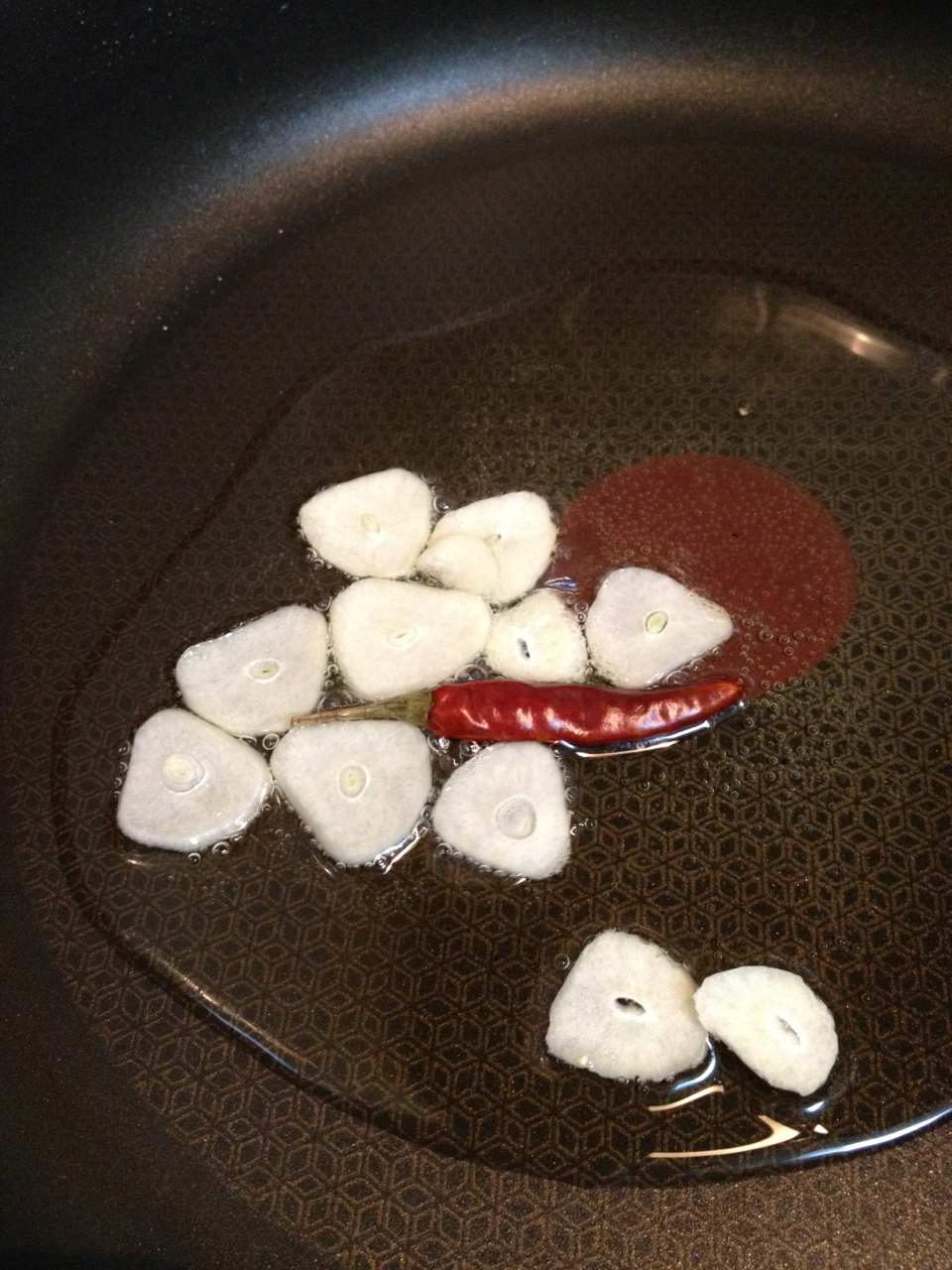 ニンニクを炒め始める時に、鷹の爪を丸ごと1本入れます。