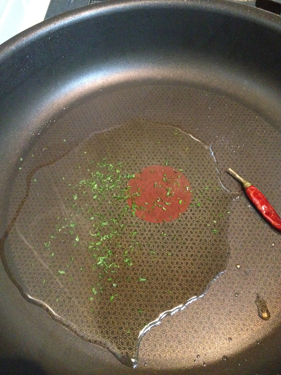 こちらはじっくり長時間加熱をすることで、鷹の爪の風味をオイルに移す役割です。