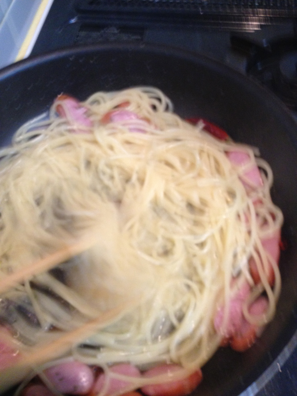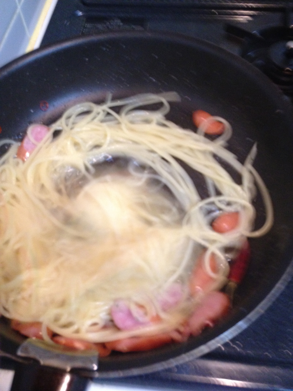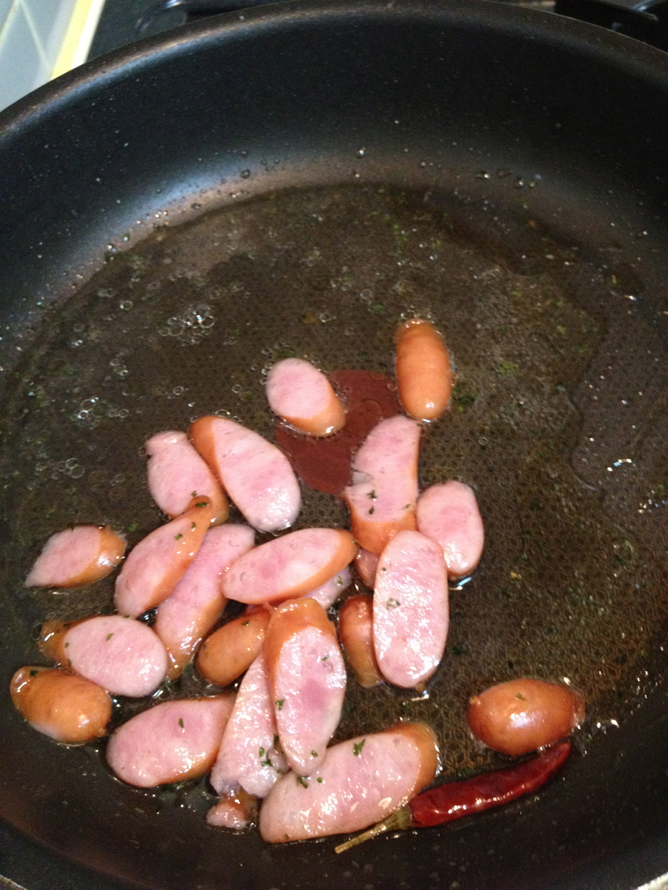 ソーセージとオイル、それにパセリが入ったフライパンに茹で湯を投入したところ。
