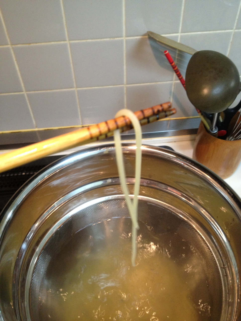 「揚げ」とは、オイルが高温になると、茹で上がったパスタを油で「揚げる」感じになります。