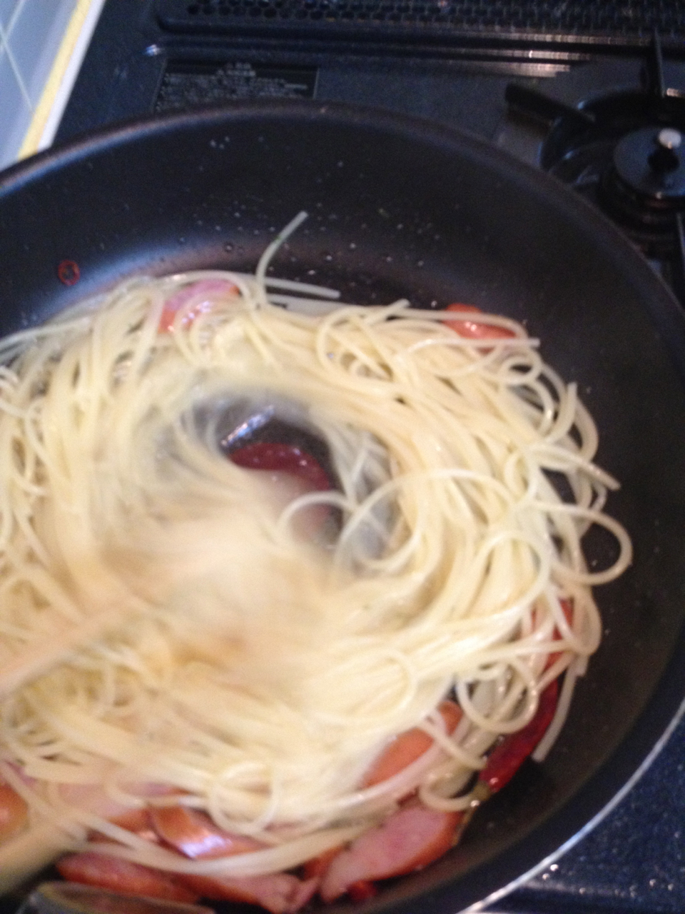 フライパンにパスタを入れたら、ガスを強火にして一気に加熱します。