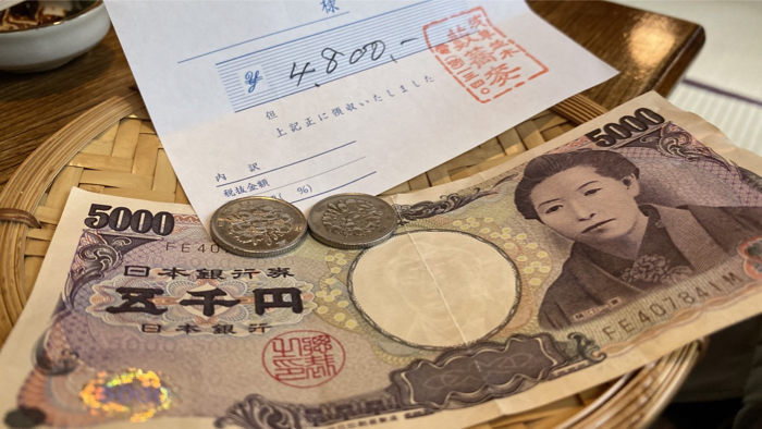 ▲ お会計をお願いしたら、お釣りと領収書がザルに乗ってきた。
