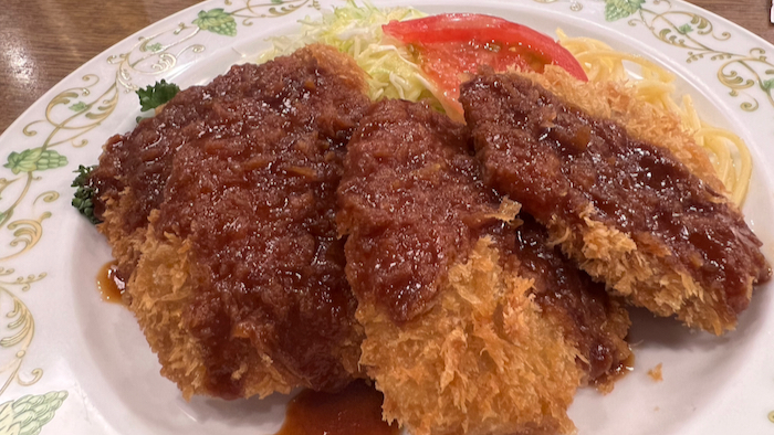 洋食屋さん典型的な粗くサクサクな衣とデミグラスっぽさが入ったソースが掛かって登場する。