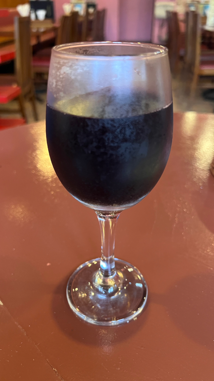 ▲ グラスワインの赤で乾杯。