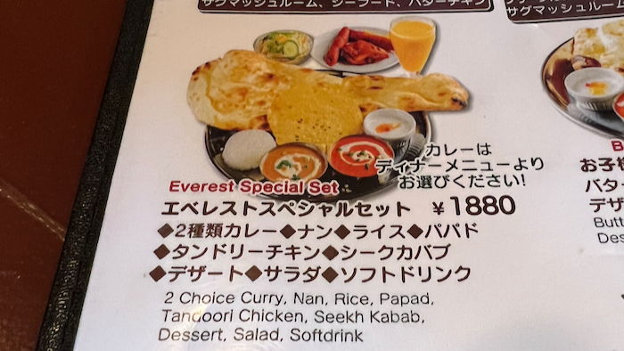 ▲ こちらのエベレストスペシャルセットにすると、グランドメニューからカレーを2種選べるのでお気に入り。