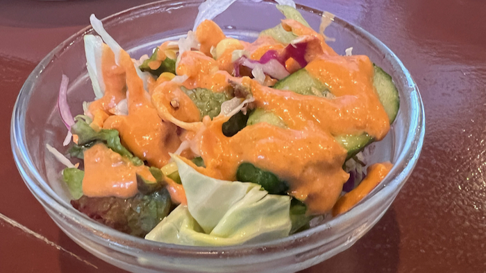 ▲ サラダの謎ドレッシング。最近話題になっていて瓶詰めでも販売されているね。