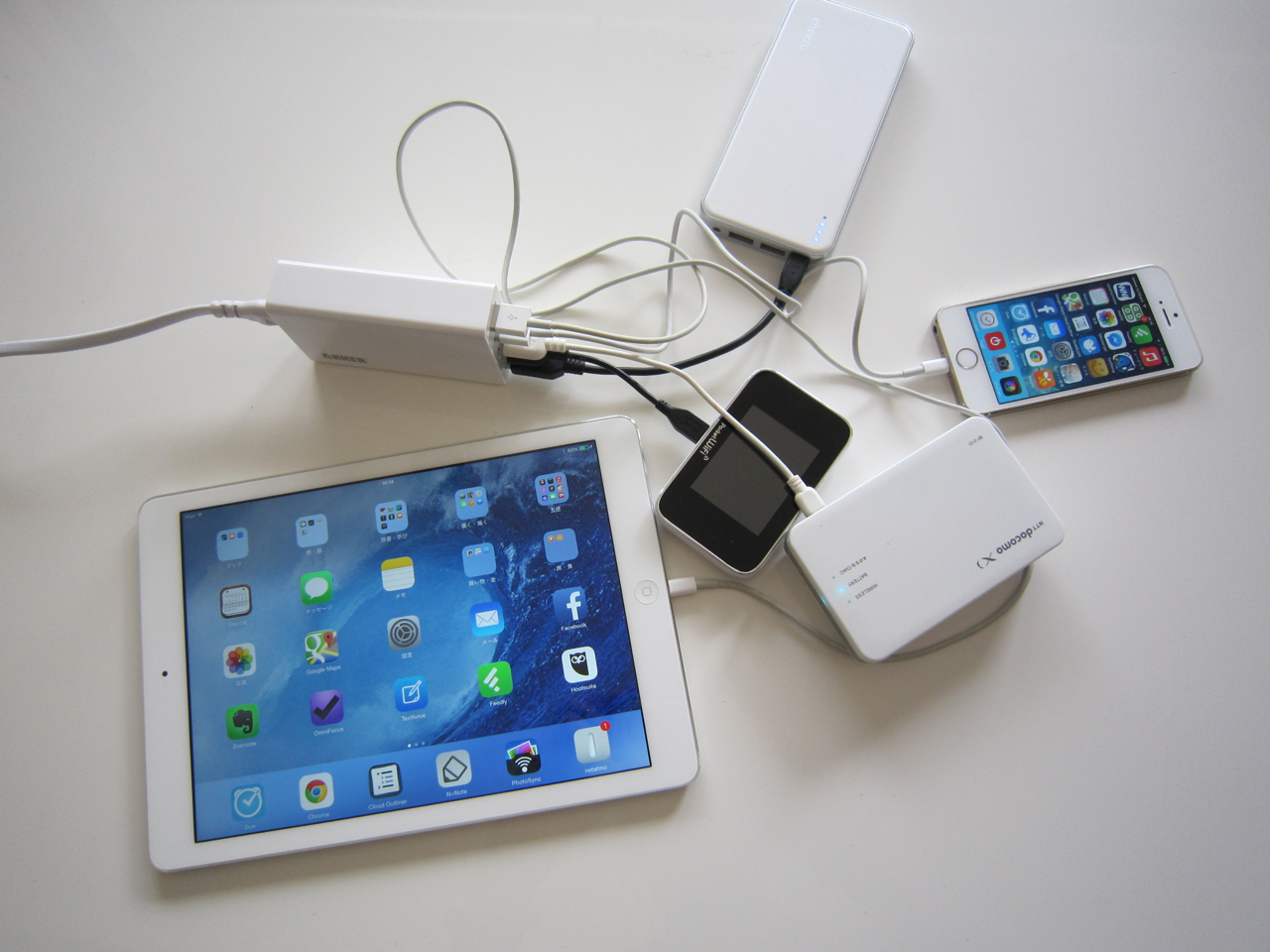 iPad Air、iPhone 5s、docomoのルーター、Pocket WiFi、モバイルバッテリーを充電中。