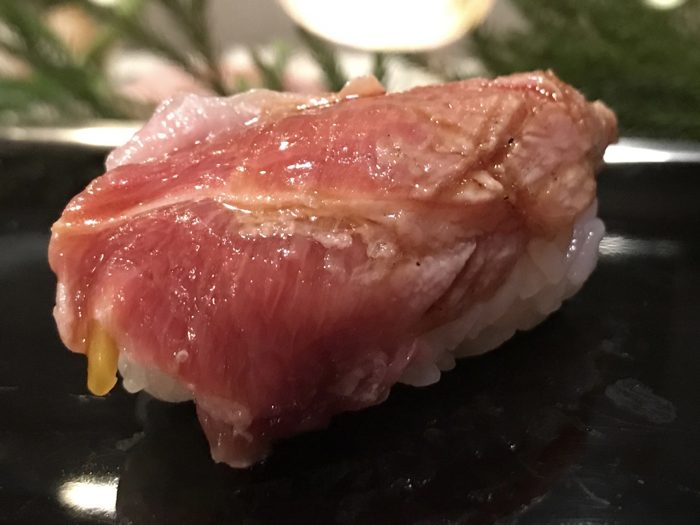 写真に写っていない向こう側の縁だけを軽く炙ってあり、つぼ漬けがちょっとだけ挟んである。