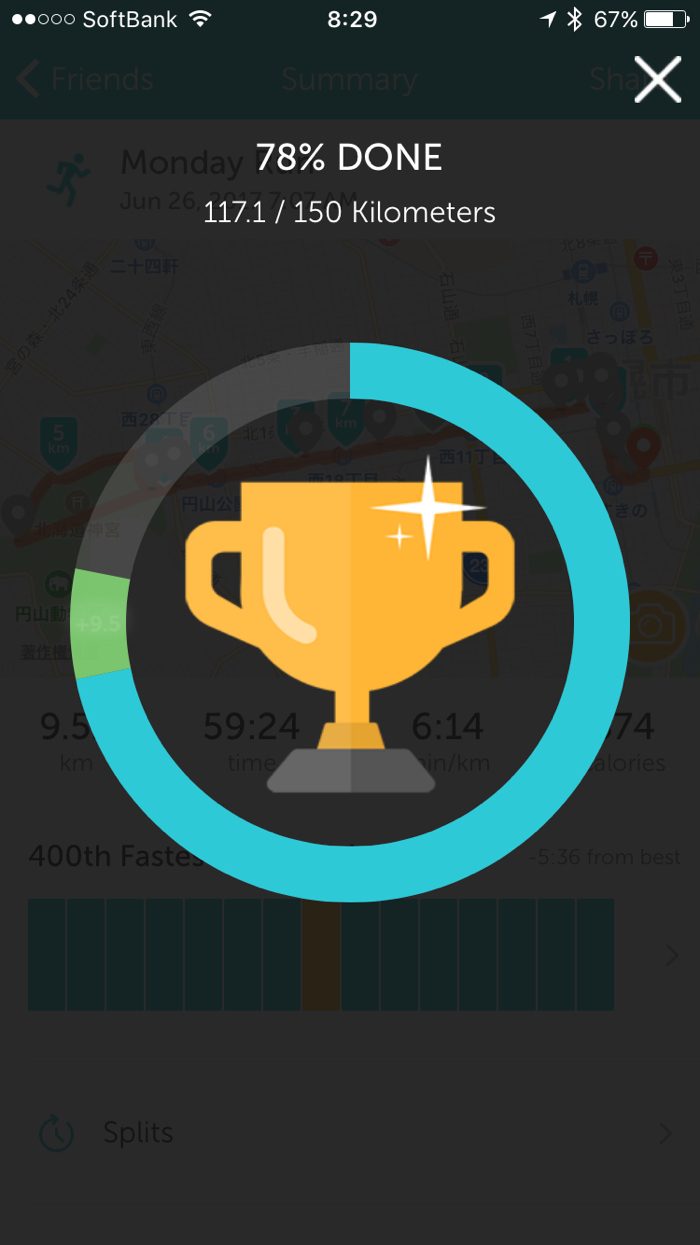 ▲ 今日の11kmで6月の目標150km走にぐっと近づいた。