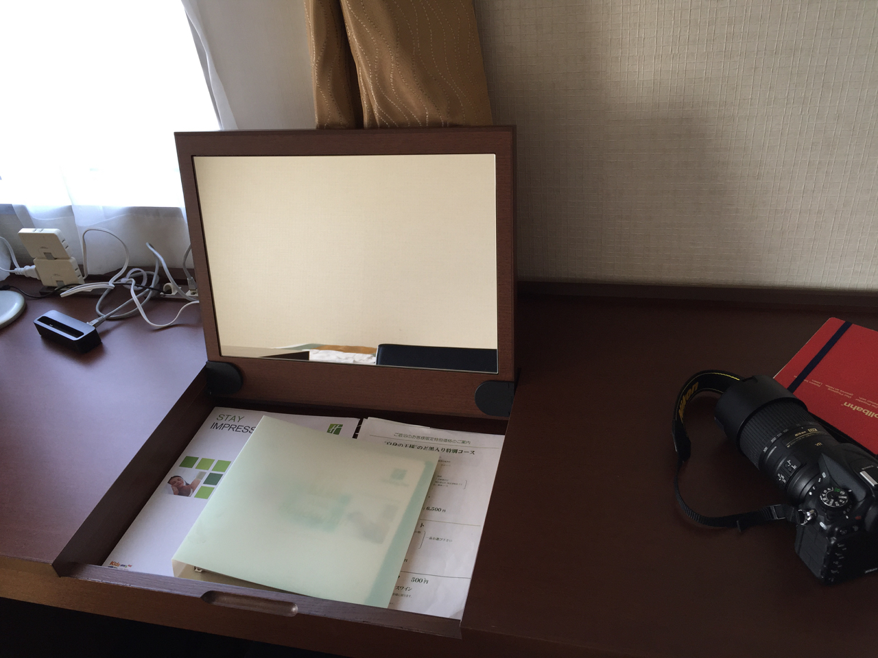 ▲ デスクに跳ね上げ式の書類入れがあった。裏に鏡がついている。