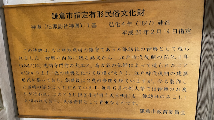 ▲ 三基のお神輿のうち、旧諏訪神社の神輿は鎌倉市の「指定有形民族文化財」になっている。