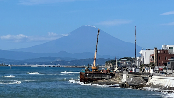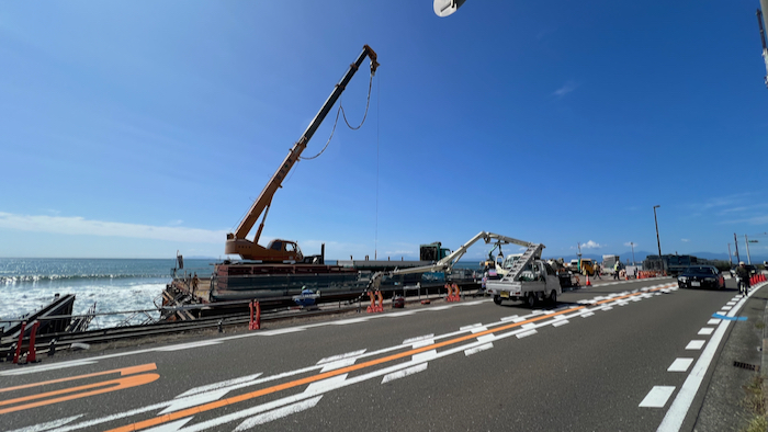 2019年夏と秋に2回台風で国道134号の歩道が高波でえぐられてしまった場所の工事が延々と続いている。