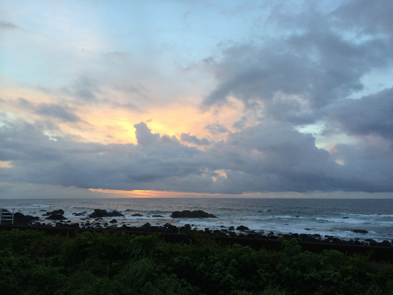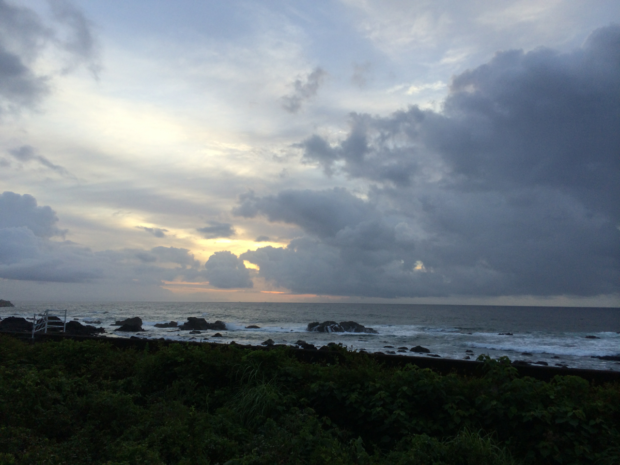朝焼けも見えているが、水平線付近は分厚い雲に覆われている。