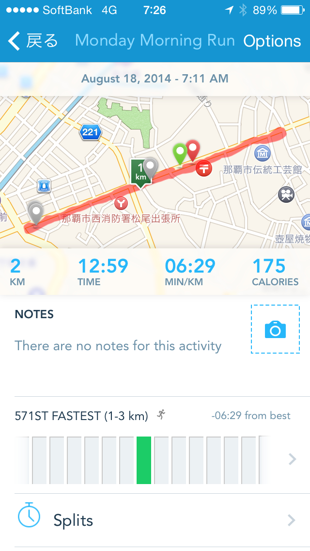 ちょっとは身体を動かしたほうが疲れが抜けるので、2kmだけ走っておく。